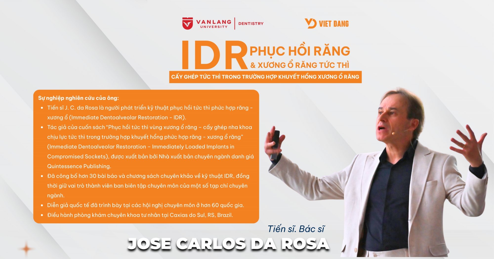 Với hơn 30 năm kinh nghiệm trong lĩnh vực implant, TS.BS. José Carlos da Rosa đã nghiên cứu chuyên sâu về sinh học ổ răng, tái tạo xương và mô mềm quanh implant. Kỹ thuật IDR được ông phát triển liên tục trong nhiều năm, dựa trên dữ liệu lâm sàng và theo dõi dài hạn.