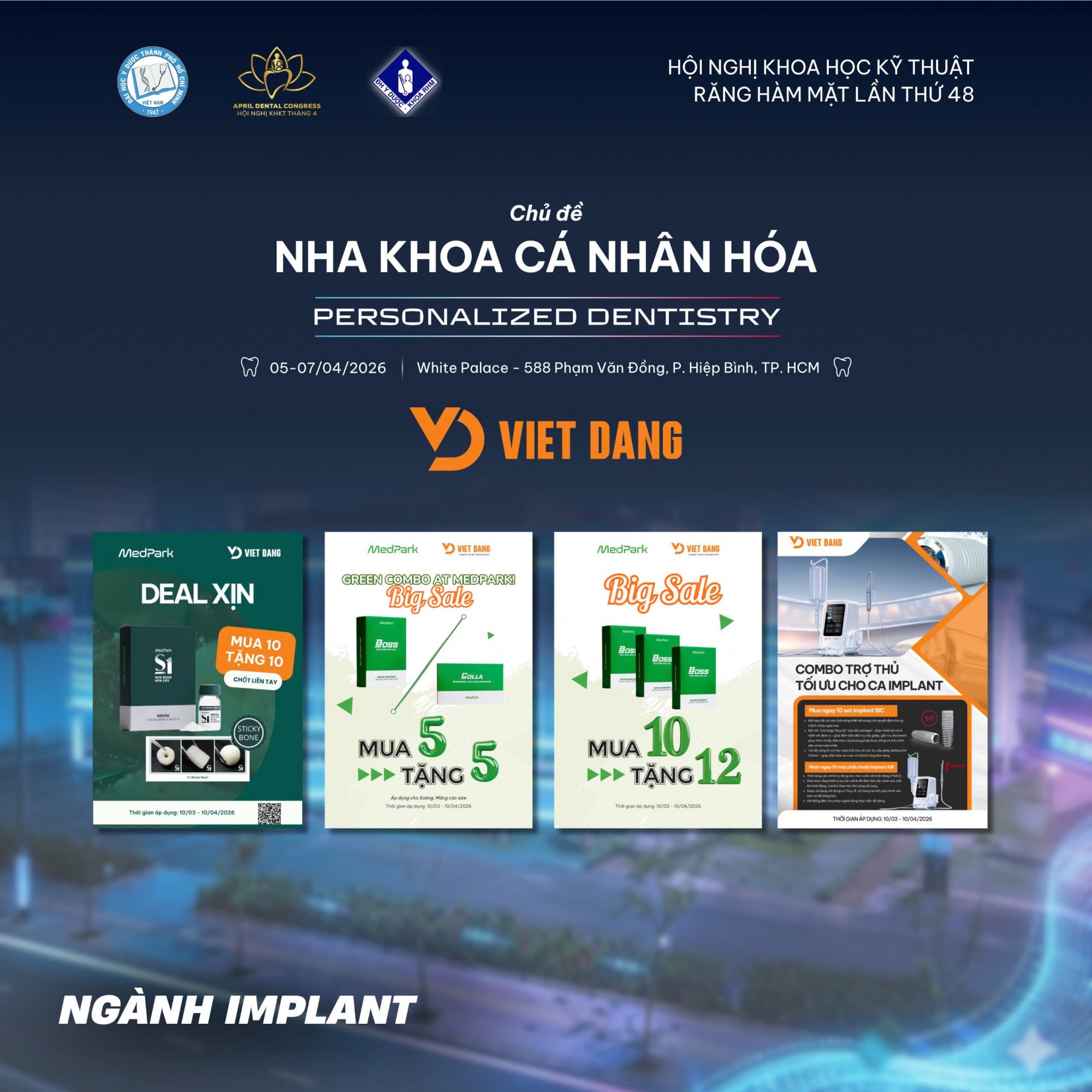 Ưu đãi độc quyền: Chương trình khuyến mãi đặc biệt dành riêng cho khách tham quan tại Hội nghị tháng 4, áp dụng Quý Bác sĩ và Quý Khách hàng mua sản phẩm của các ngành: Vật Liệu, Chỉnh Nha, Implant, Lab, Thiết bị.